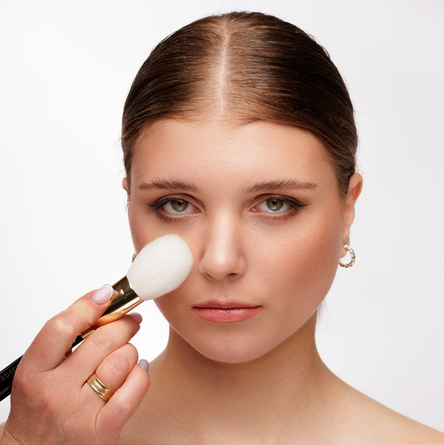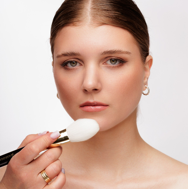 HOW TO: Nimm mit dem Pinsel etwas Puder auf und verteile das Produkt großflächig auf dein Gesicht oder Dekolleté.